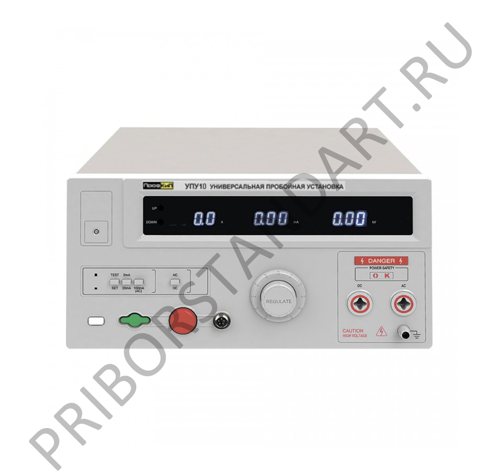 Высоковольтная пробойная установка ПрофКиП УПУ10 предназначена для генерирования напряжения постоянного и переменного тока синусоидальной формы, для проведения испытаний на проверку напряжения пробоя, измерения тока утечки и других показателей эффективности электрической безопасности изоляции силовых кабелей, электроустановок, диэлектриков, средств защиты и т.д. Так же универсальная пробойная установка ПрофКиП УПУ10 может выступать в качестве источника питания высокого напряжения постоянного тока, для проверки характеристик компонентов и приборов.