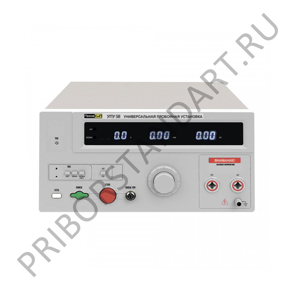 Высоковольтная пробойная установка ПрофКиП УПУ5М предназначена для генерирования напряжения постоянного и переменного тока синусоидальной формы, для проведения испытаний на проверку напряжения пробоя, измерения тока утечки и других показателей эффективности электрической безопасности изоляции силовых кабелей, электроустановок, диэлектриков, средств защиты и т.д. Так же универсальная пробойная установка ПрофКиП УПУ5М может выступать в качестве источника питания высокого напряжения постоянного тока, для проверки характеристик компонентов и приборов.
