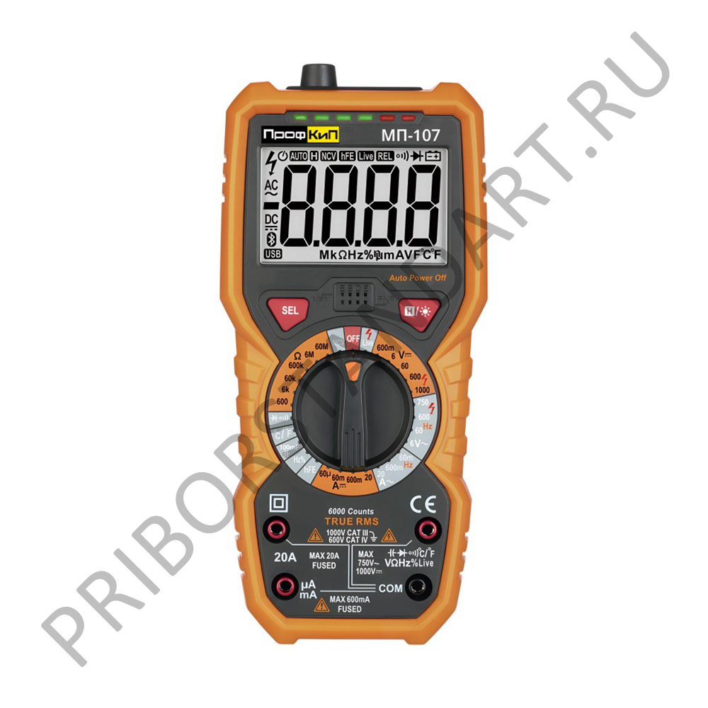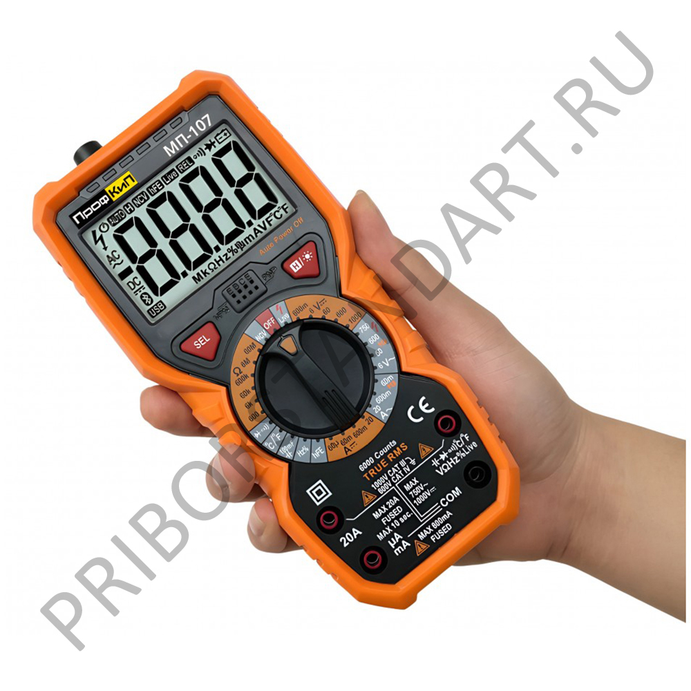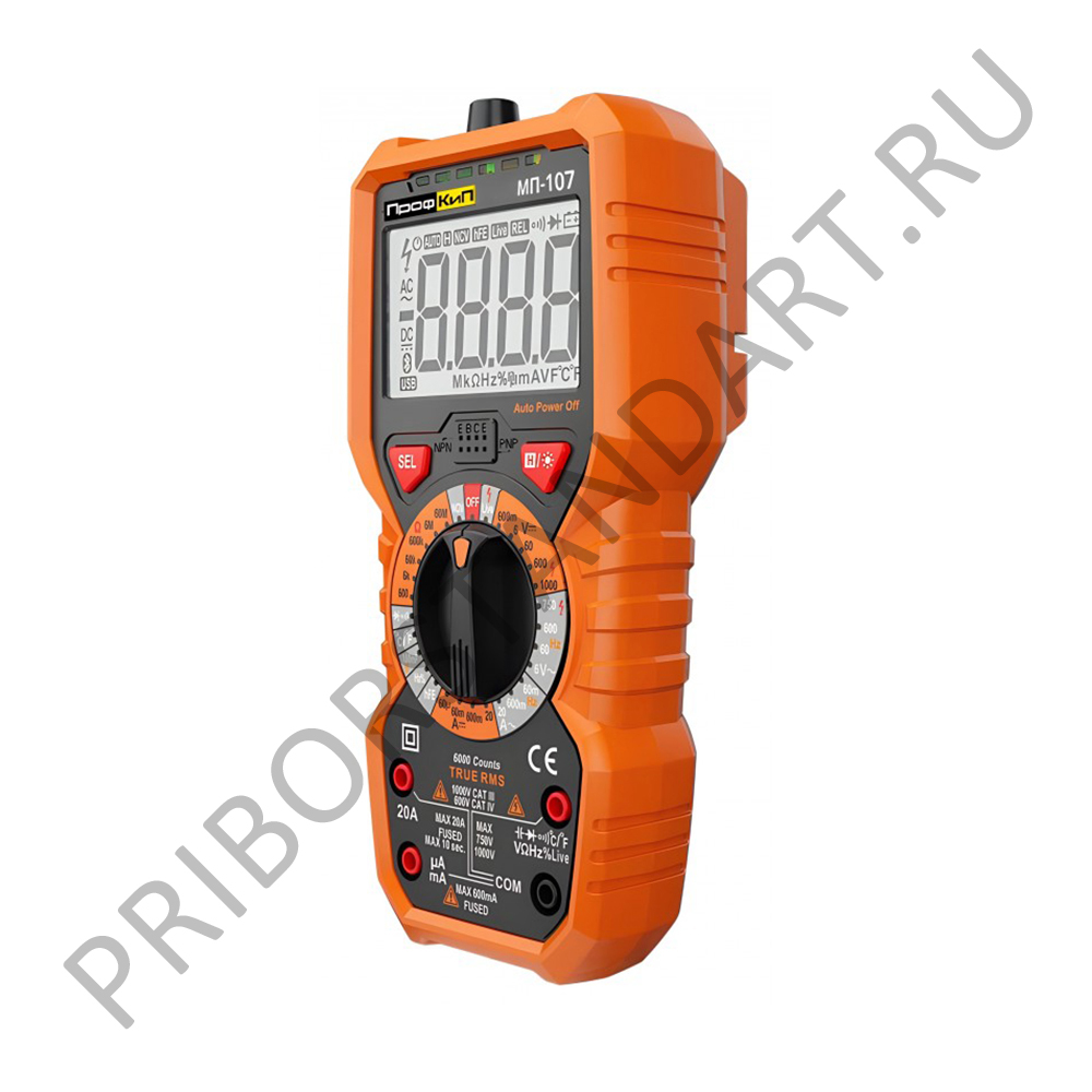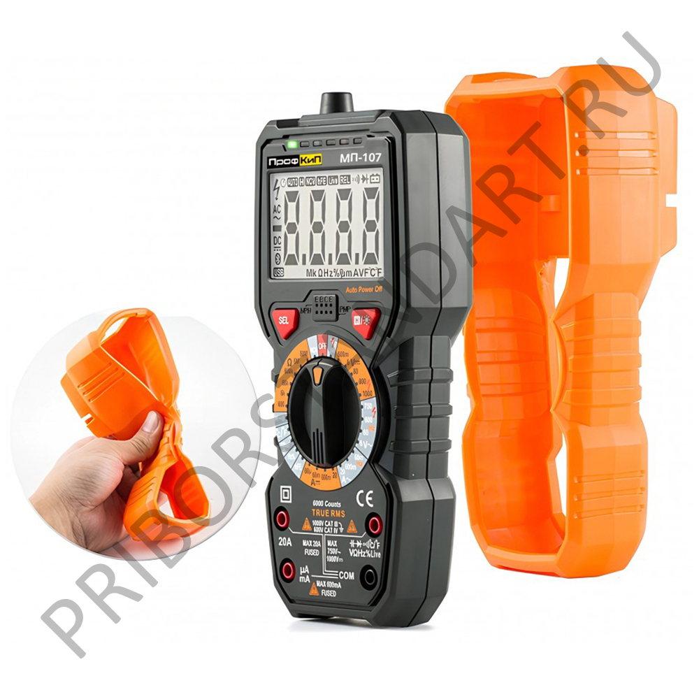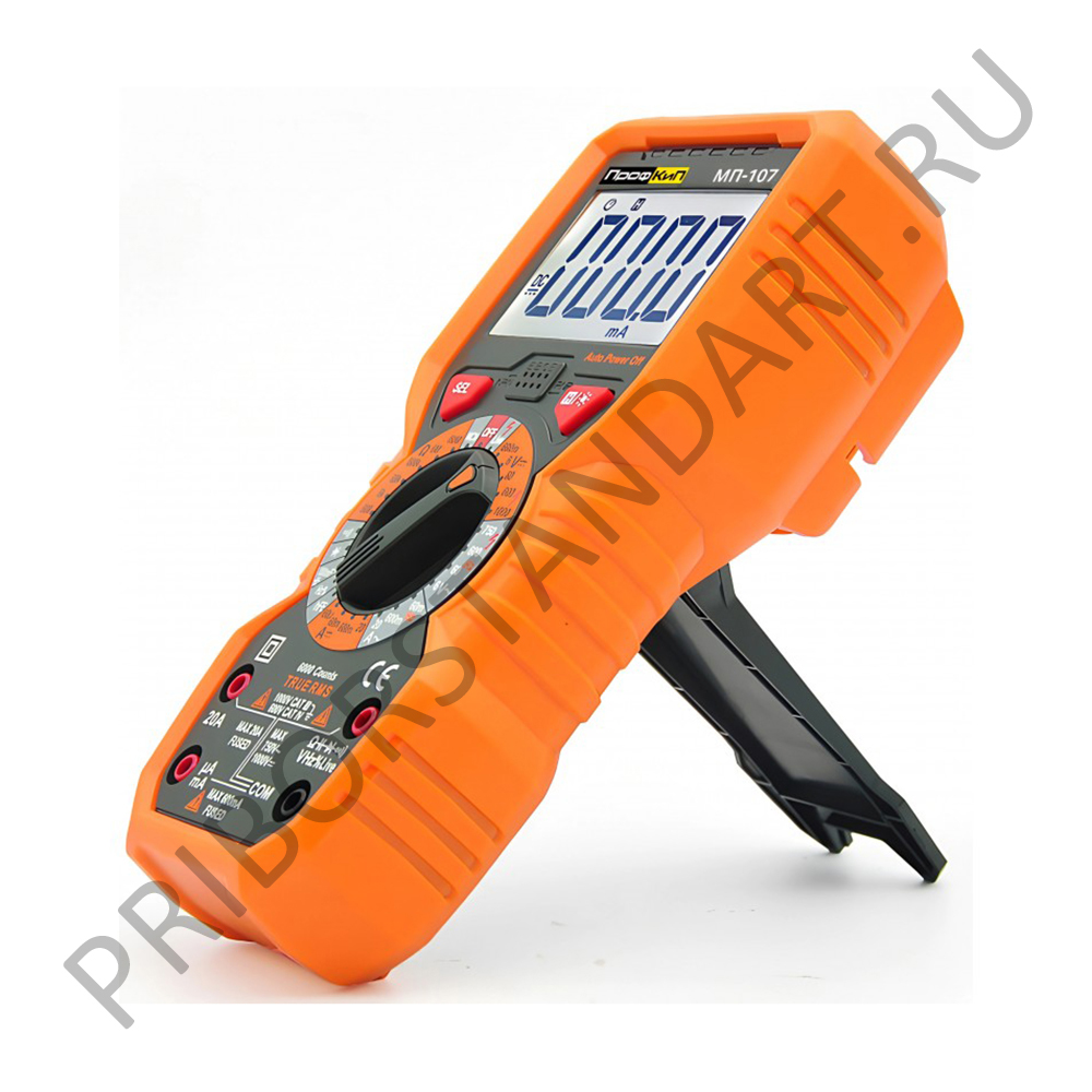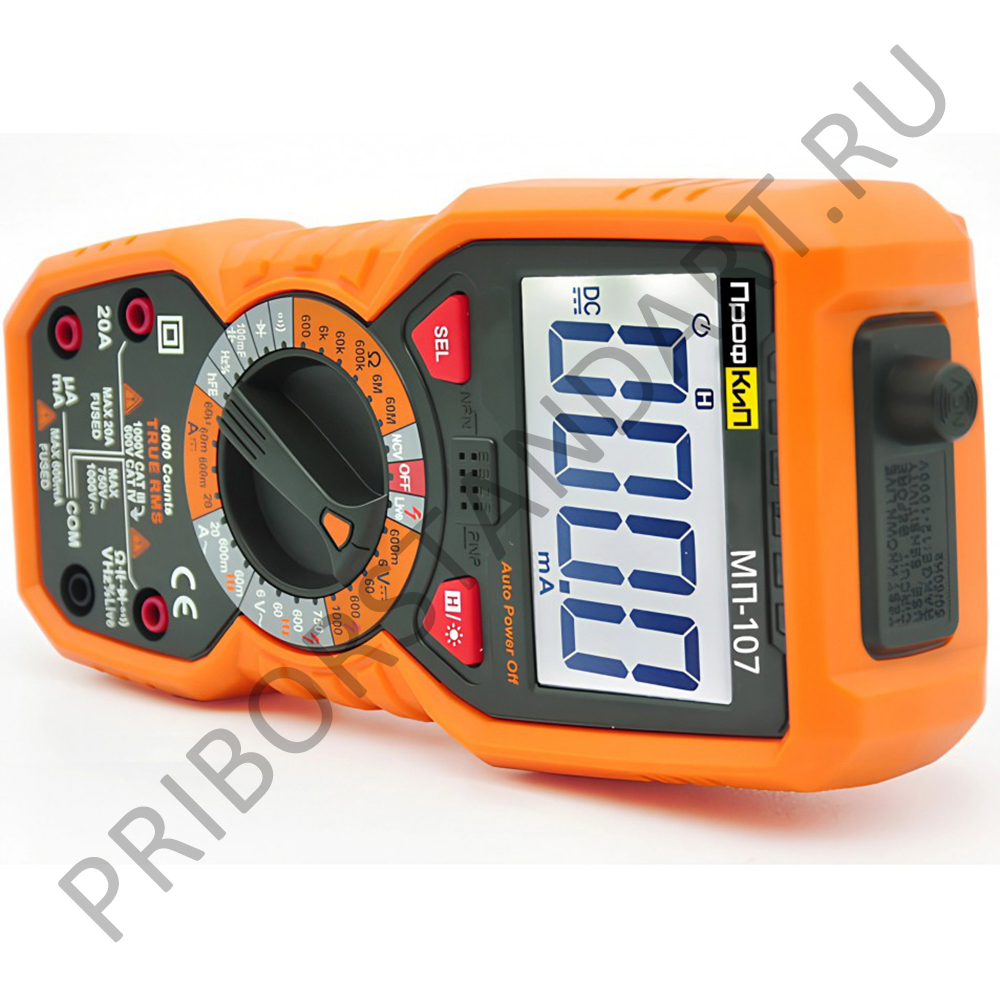 | Мультиметры переносные ПрофКиП МП-107 предназначены для измерения напряжения постоянного и переменного тока, силы постоянного и переменного тока, сопротивления постоянному току, электрической ёмкости и частоты. Приборы оснащены жидкокристаллическими дисплеями для индикации результатов измерений. Мультиметры отличает компактность, незначительная масса и возможность автономного питания в различных условиях эксплуатации. Мультиметры предназначены для использования в цеховых и лабораторных условиях, при наладке и ремонте радиотехнического оборудования, электронных схем и узлов автоматики, а также при тестировании и ремонте промышленных электросетей. Портативные многофункциональные цифровые мультиметры с функцией измерения среднеквадратического значения, оснащенные большим ЖК-дисплеем с задней подсветкой для удобства считывания показания, и фонарем. Имеют функцию защиты от перегрузки и индикацию разряженной батареи. Измеряют температуру с помощью термопары типа К в диапазоне от -20°C до +1000°C. Идеальные профессиональные многофункциональные измерительные приборы для производства, образования и домашнего хозяйства |