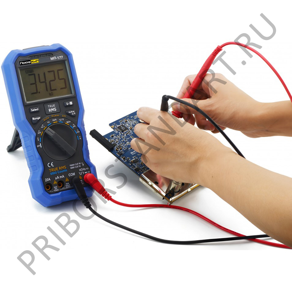 | Мультиметры переносные ПрофКиП МП-177 предназначены для измерения напряжения постоянного и переменного тока, силы постоянного и переменного тока, сопротивления постоянному току, электрической ёмкости и частоты. Приборы оснащены жидкокристаллическими дисплеями для индикации результатов измерений. Мультиметры отличает компактность, незначительная масса и возможность автономного питания в различных условиях эксплуатации. Мультиметры предназначены для использования в цеховых и лабораторных условиях, при наладке и ремонте радиотехнического оборудования, электронных схем и узлов автоматики, а также при тестировании и ремонте промышленных электросетей. Высокоточный прибор для измерения параметров тока, напряжения и сопротивления. Модель позволяет работать с током AC до 10А и DC до 20А, напряжением AC до 750В и DC до 1000В, а также сопротивлением до 60МОм. Дополнительно измеряет ёмкость до 60мФ и частоту сигнала до 9999кГц. Температурный диапазон от -50 до +400°C. Инновационный дисплей с подсветкой обеспечивает четкость показаний. Функции включают встроенный фонарик, авто/ручное изменение диапазонов, HOLD, индикатор заряда батареи, бесконтактный индикатор напряжения |