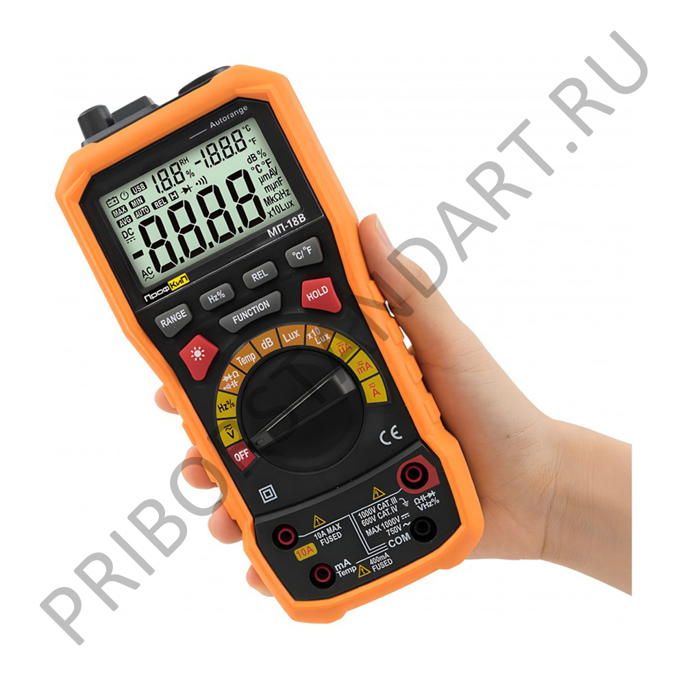 | Мультиметры переносные ПрофКиП МП-18В предназначены для измерения напряжения постоянного и переменного тока, силы постоянного и переменного тока, сопротивления постоянному току, электрической ёмкости и частоты. Приборы оснащены жидкокристаллическими дисплеями для индикации результатов измерений. Мультиметры отличает компактность, незначительная масса и возможность автономного питания в различных условиях эксплуатации.Портативный многофункциональный цифровой измерительный прибор, объединивший в одном несколько разных приборов: шумомер, измеритель освещенности, измеритель влажности, термометр и цифровой мультиметр. ПрофКиП МП-18В имеет большой ЖК-дисплей (одновременно отображение трех числовых значений) с задней подсветкой для удобства считывания показания. Имеет функцию защиты от перегрузки и индикацию разряженной батареи.Идеальный профессиональный многофункциональный измерительный прибор для производства, образования, хобби и домашнего хозяйства. |