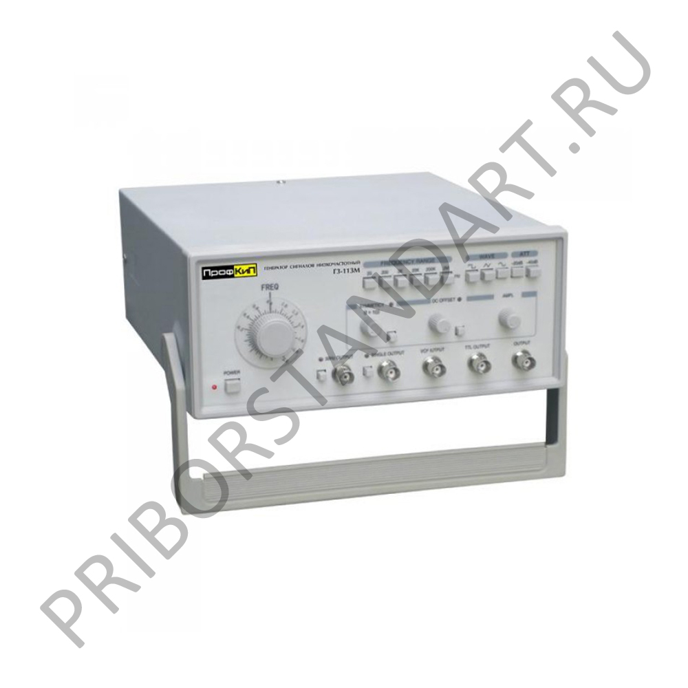 Генератор сигналов низкочастотный ПрофКиП Г3-113М - предназначен для исследования, настройки и испытаний систем и приборов, используемых в радиоэлектронике, связи, автоматике, вычислительной и измерительной технике, приборостроении. Прибор обеспечивает формирование сигналов прямоугольной, треугольной, синусоидальной и т.д. Прибор относится к серии бюджетных генераторов сигналов низкой частотыОсобенности и преимущества генератора сигналов низкочастотного ПрофКиП Г3-113М