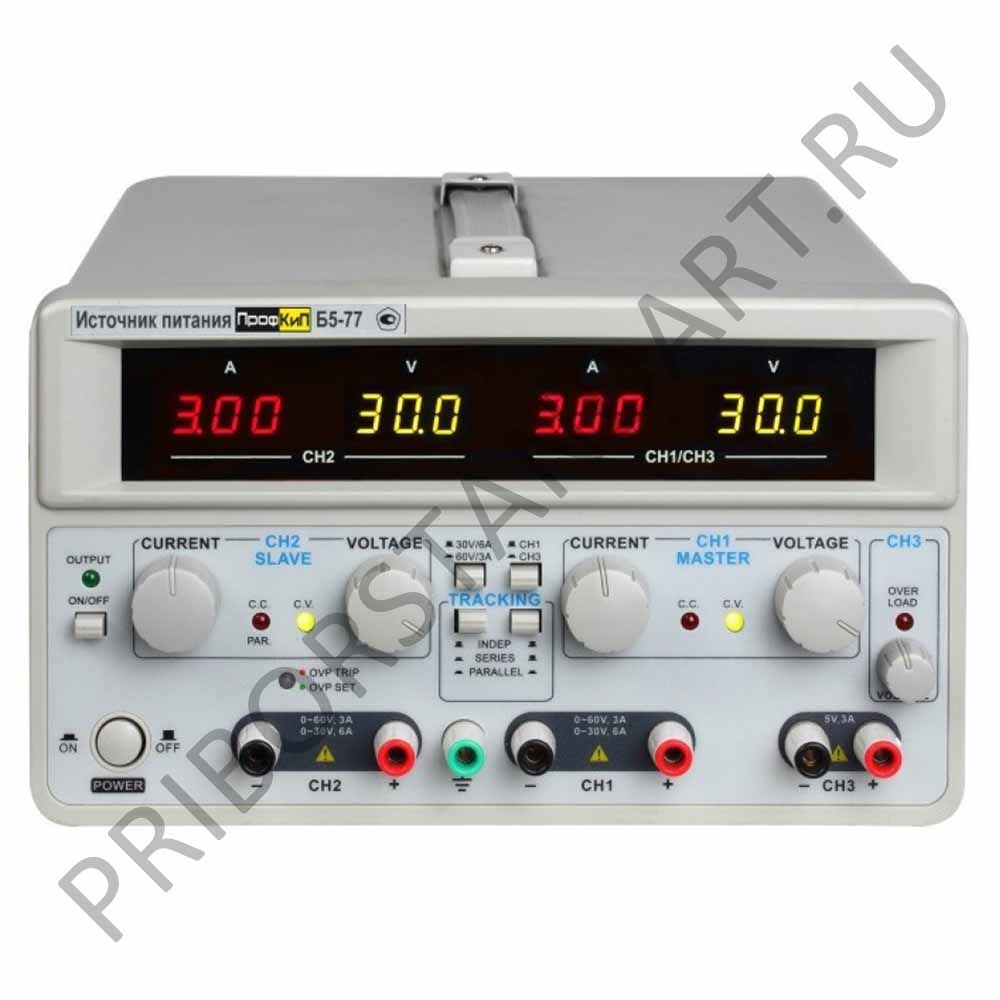 Источники питания ПрофКиП Б5-77 предназначены для питания стабилизированным напряжением и током узлов, и схем радиоэлектронной аппаратуры, при проведении работ в процессах наладки, ремонта и лабораторных исследований. Источники питания отличаются от аналогичных моделей малым уровнем шумов и пульсаций выходного напряжения и тока. Приборы включены в государственный реестр средств измерений РФ и допущены к применению в сфере метрологического контроля.